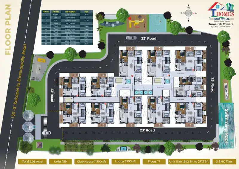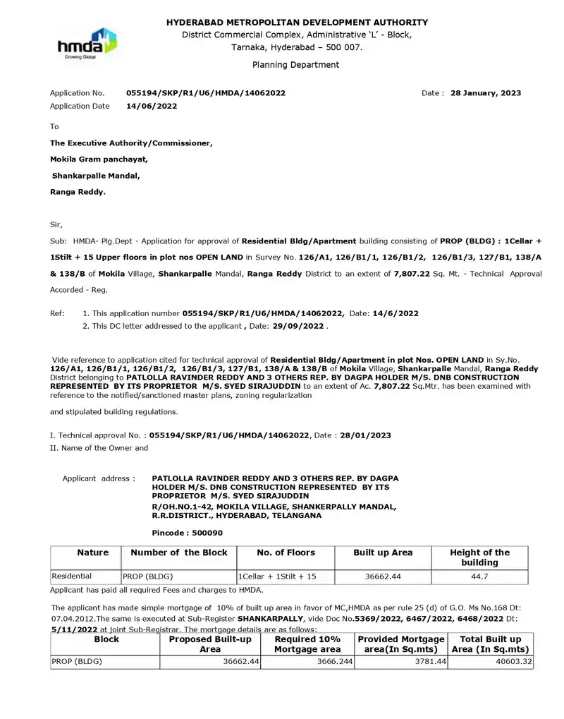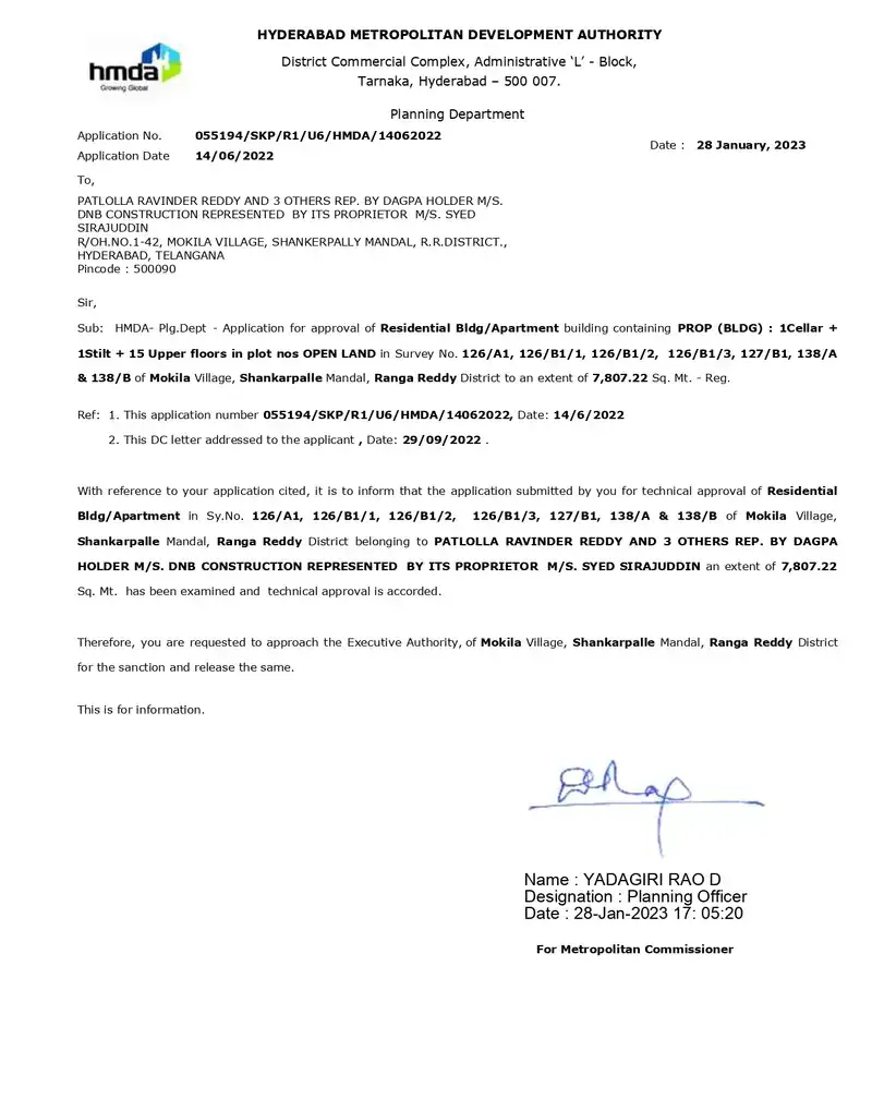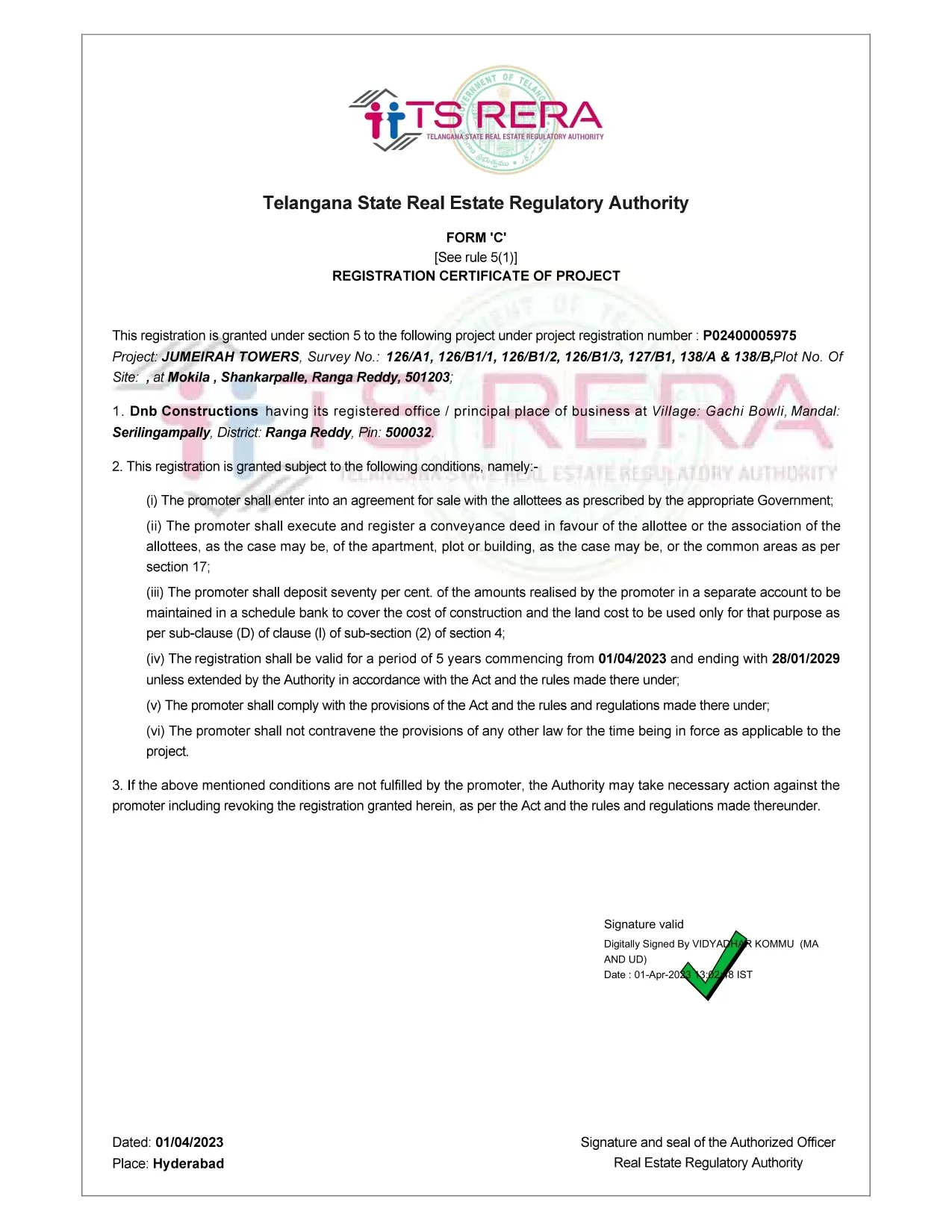 DNB Constructions focuses on completing projects within promised timelines while maintaining structural quality. T Homes Jumeirah Towers is RERA-approved (P02400005975) and HMDA-approved, with construction nearing completion for Aug 2026 possession.